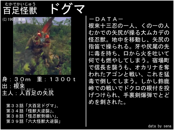 | ムカデの怪忍獣ドグマを操る術を得意とする根來のくの一。 風葉と共に宿場町で信長を襲い、ドグマを暴れさせるが赤影たちの反撃で撤退。 鈴鹿峠で再びドグマをけしかける。用済みとなった風葉を斬り捨てる冷酷な薙刀使い。 演:末広 真樹子 登場話:第33話「大百足ドグマ」、第34話「怪獣大逆襲」 |