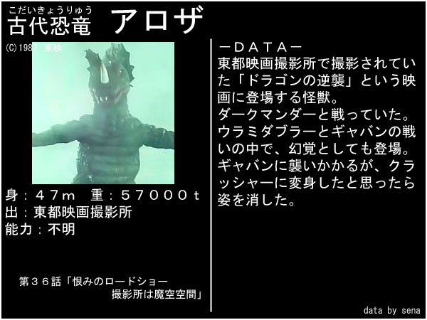 | アロザは円谷プロ制作「ミラーマン」第18話に登場した怪獣である。宇宙刑事ギャバンは東映制作の作品であり、実際問題特に関連性はない。どういった経緯で本作に登場することになったかは定かではないが、結果的に円谷プロと東映のコラボレーションになっている点も見逃せない。円谷と東映の正式なコラボ作品は、後のオリジナルビデオ・ウルトラマンVS仮面ライダーとなる。 | |||